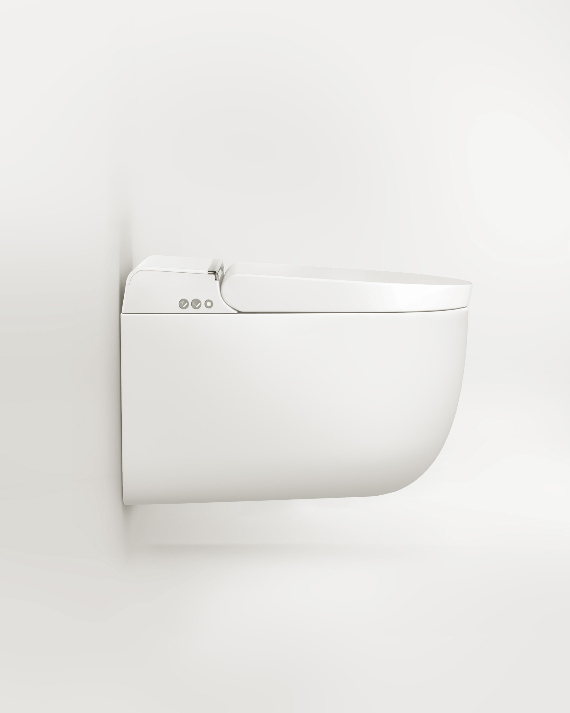 Ceramic wall-hung Smart Rimless Wc in Hype collection with electronic bidet module and remote control 38 x 59 in size.